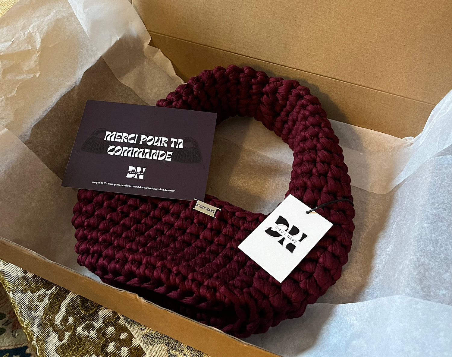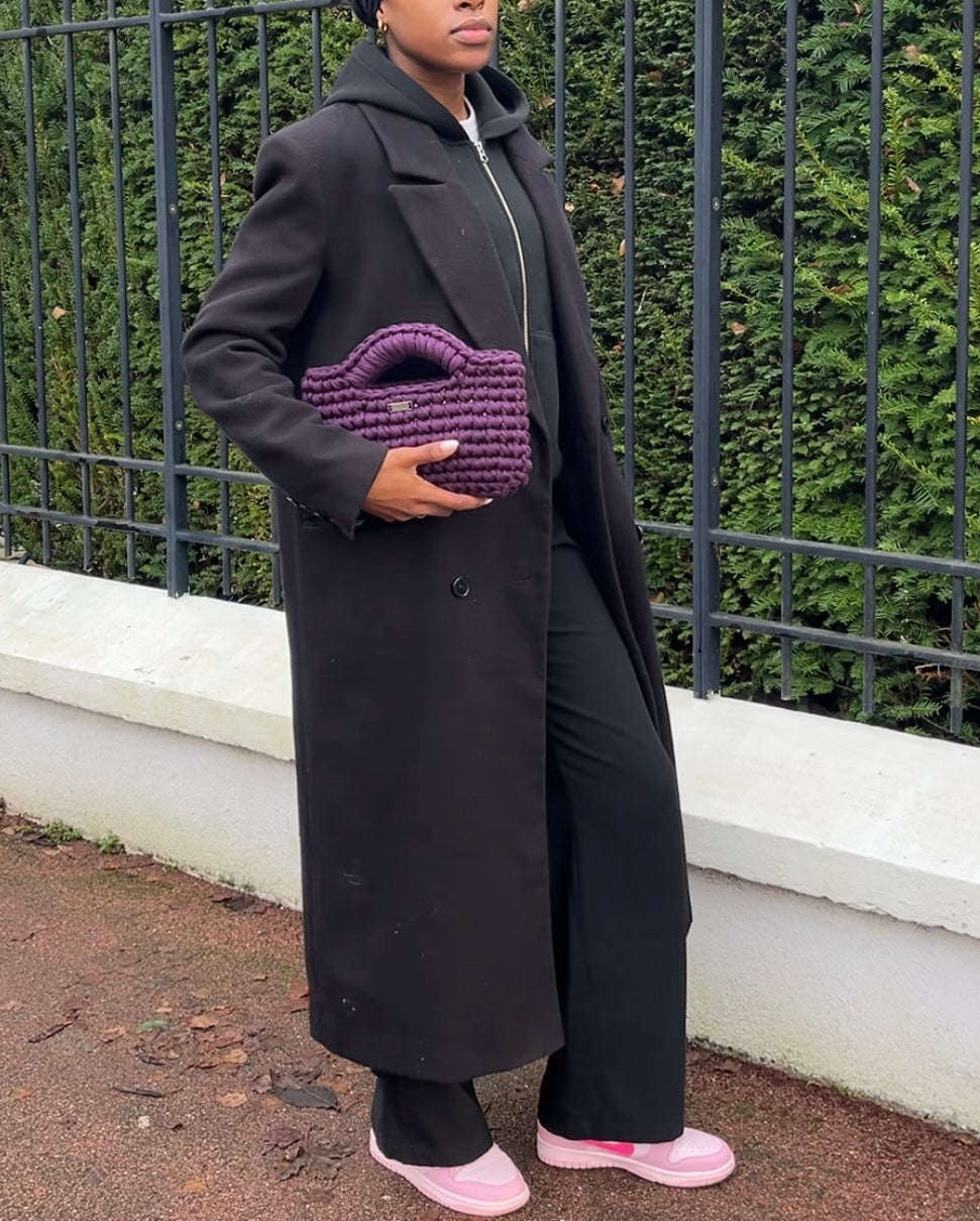 Élégant, structuré et entièrement fait main, Confectionné en fil recyclé, il allie style affirmé et éthique durable.Pensé pour être porté à la main ou au poignet, il s’adapte à toutes les occasions.